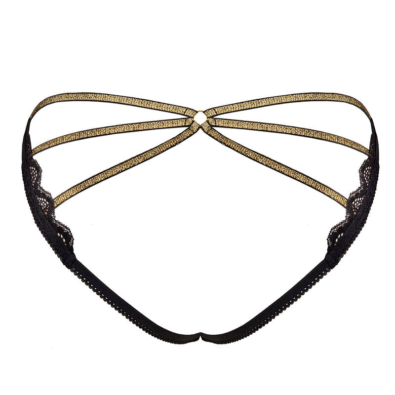 Les culottes noires uniques et extraordinaires sont l'incarnation de la féminité, du sex-appeal et de la sensualité. Le dos discret, qui est une combinaison de subtiles décorations en dentelle et de bretelles expressives qui soulignent et mettent en valeur les fesses, donne du caractère à ce modèle et le distingue des autres options classiques. Panty Muled, c'est aussi un équilibre entre la délicatesse de la dentelle et sa teinte noire et sombre, également quelque peu brisée par des rayures brillantes.